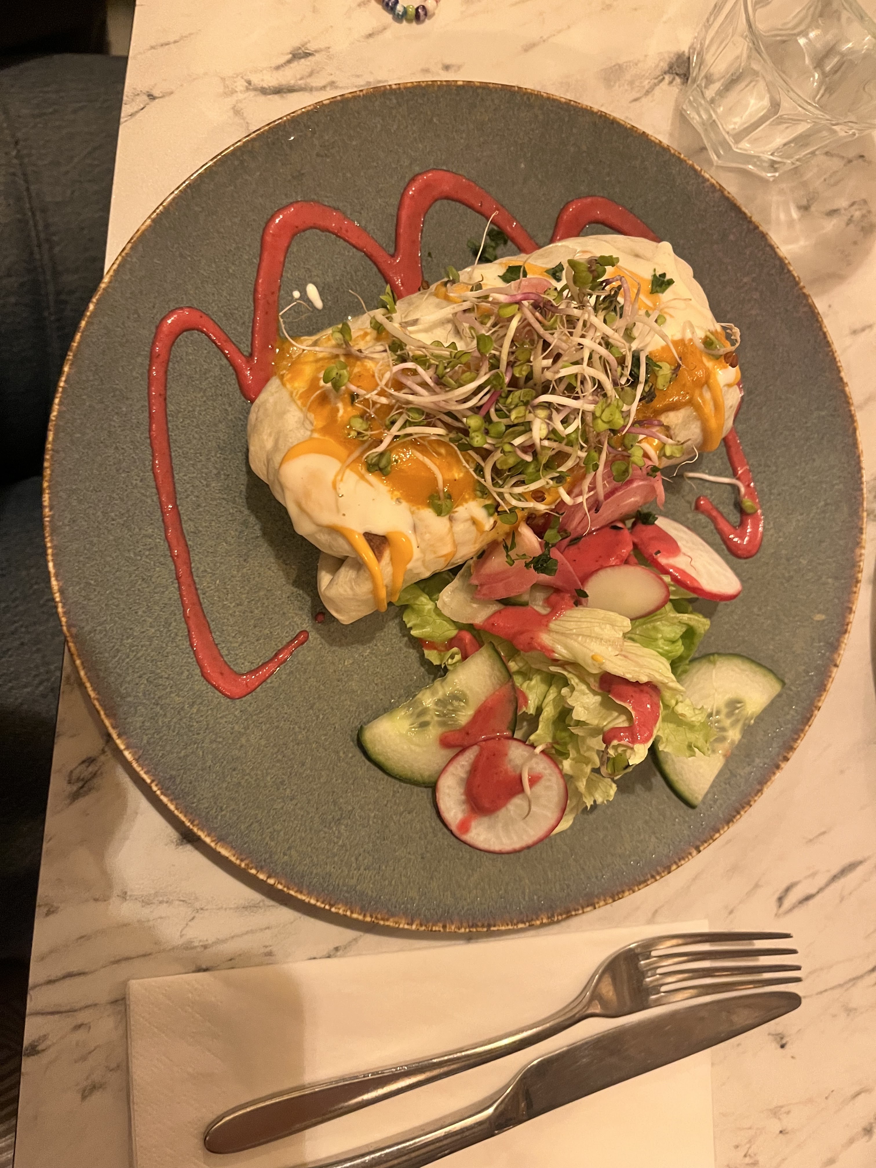 Ne vous fiez pas aux avis, ils sont totalement faux. La nourriture est immonde. Ils nous vendent un burrito avec une viande « tendre ». Et tu vois le sérieux du serveur qui n’a pas envie d’être là avec ses remarques désobligeantes : « je suis là depuis qu’une semaine », « c’est pas moi qui cuisine » quand tu lui dis que la viande est immangeable. Quand tu lui demandes d’appeler le manager, « elle est occupée ». C’est un attrape nigauds. On s’est fait avoir en regardant les photos et les avis, mais quand on montre ce qu’on veut en photos ils disent que ce ne sont pas les mêmes plats qui sont servis. Il faut boycotter ce genre d’établissement qui pensent pouvoir arnaquer les clients et que ceux ci doivent payer et manger cette chose immonde qu’ils servent sans avoir un mot à dire.